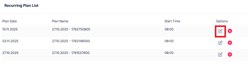 Ardından, oluşturduğunuz tekrarlayan planın satırındaki "Tekrarlayan Plan Listesi" düğmesine tıklayın.