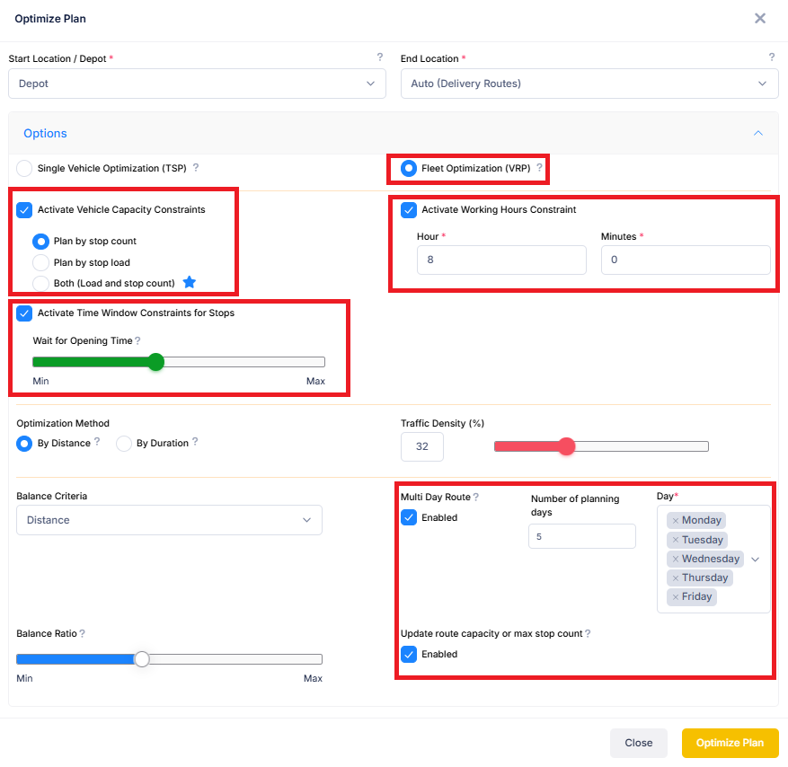 Sürücüler ve günler arasında durakları eşit olarak dağıtabilmek için "Araç Kapasitesi Kısıtlamalarını Etkinleştir" seçeneğini etkinleştirin.