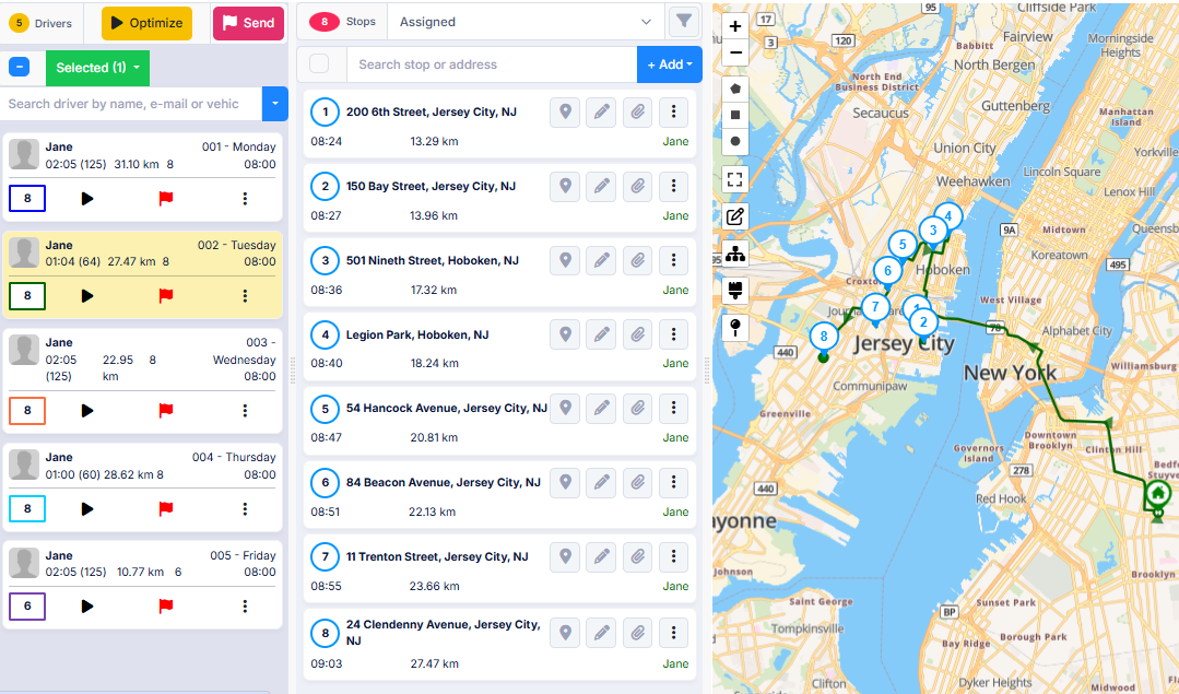 7.Sonuç haritada ve duraklar bölümünde görüntülenecektir. Gördüğünüz gibi, sürücü için haftalık bir rota planı oluşturuldu ve duraklar seçilen günlere dağıtıldı. Örneğin, Salı günkü rotaya tıkladığınızda, ortadaki bölümdeki durakları ve haritadaki rota çizgisini göreceksiniz.