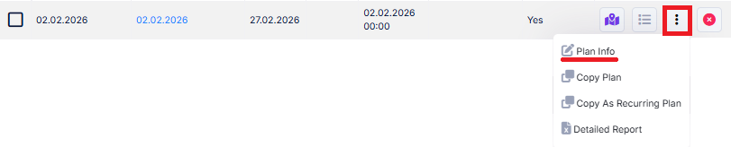 Bu ekranda herhangi bir plan görünmüyorsa endişelenmeyin. Planlar, rota tarihinden birkaç saat önce oluşturulur. Rotaların daha erken oluşturulmasını istiyorsanız, Tekrarlayan Rotalar ekranına geri dönün ve Ana planınızın sağındaki Menü düğmesine tıklayın. Ardından Plan Bilgisi düğmesine tıklayın.